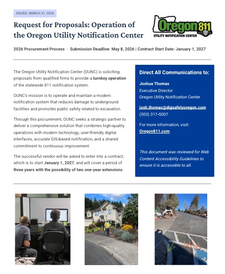 Welcome to the Oregon Utility Notification Center website. We have included a large amount of information about Call Before You Dig Issues, Oregon’s Excavation Laws, the Board of Directors, Enforcement Actions, links to other websites of interest and a variety of other information.